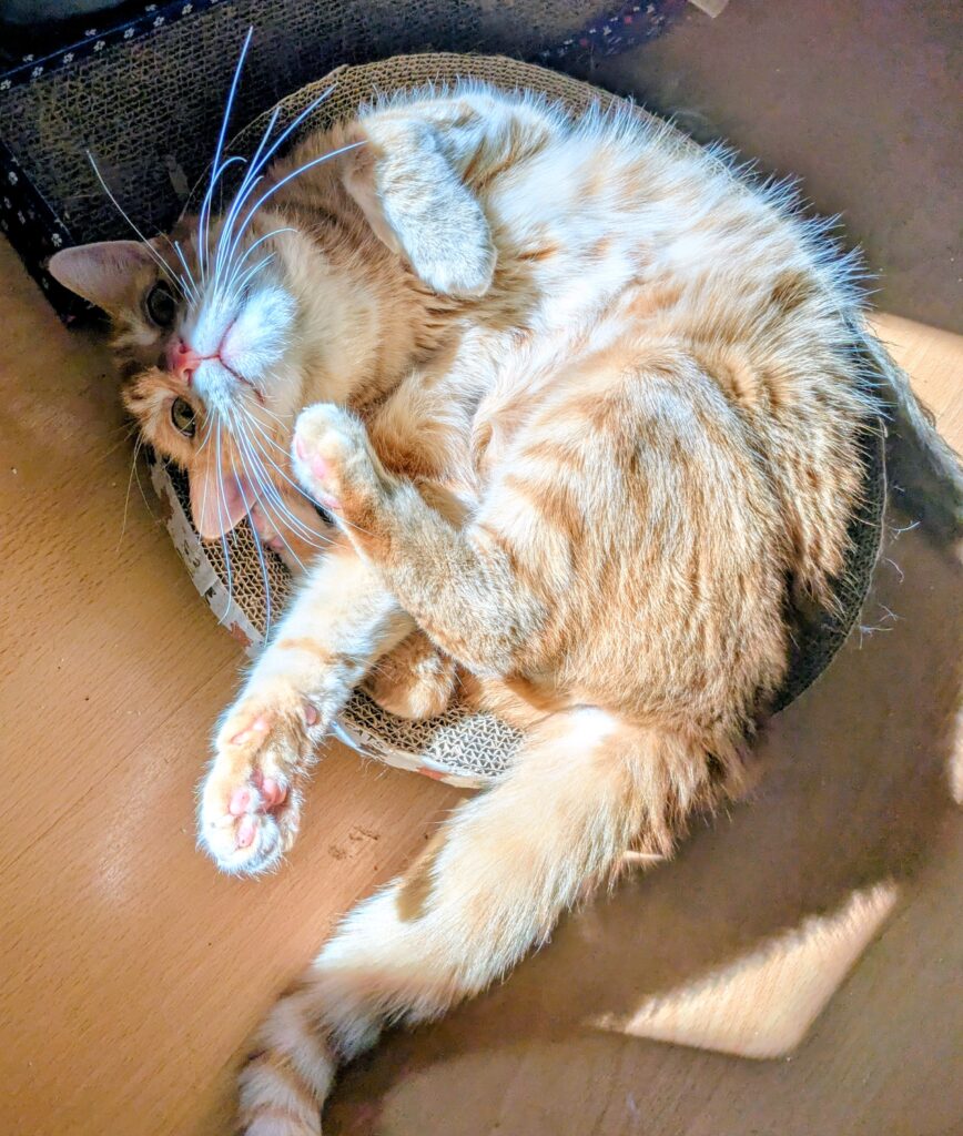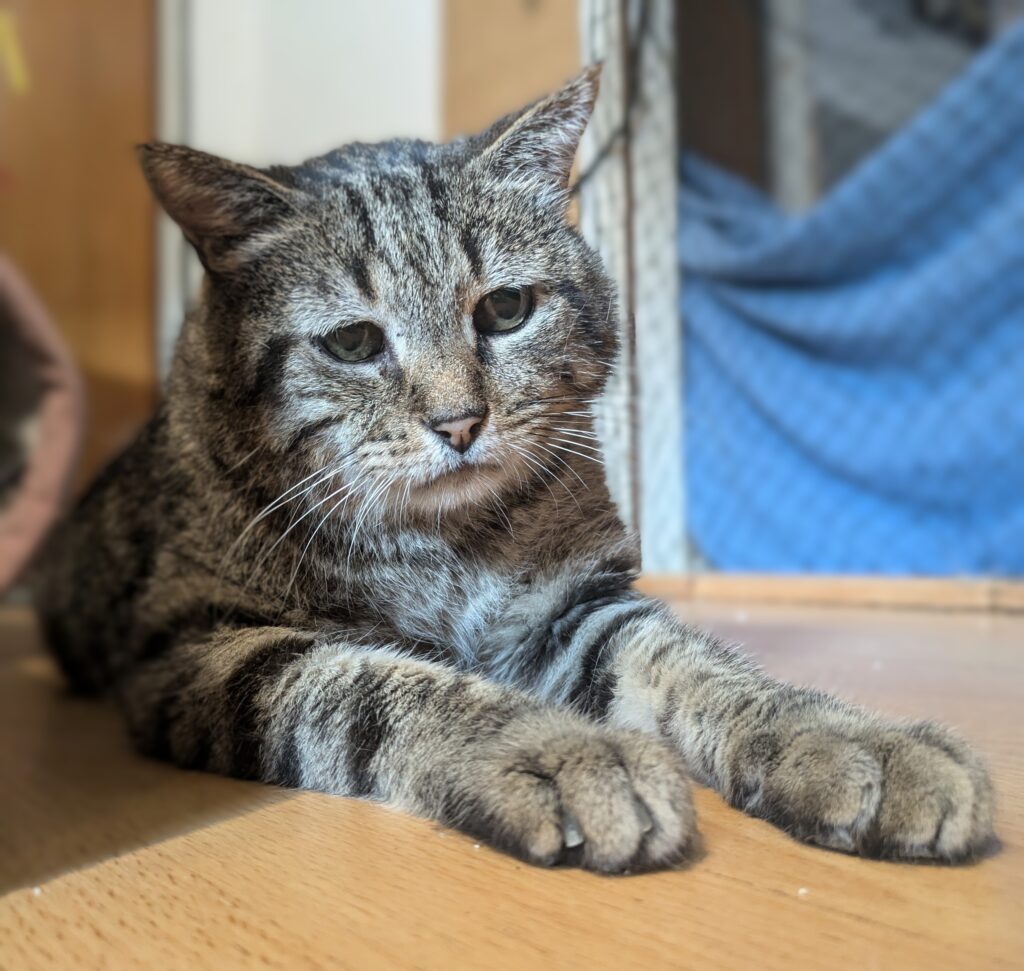 Sein Leben war nicht einfach, zuletzt lebte er auf der Straße und wurde von einem älteren Herrn versorgt, als der starb, vernachlässigte Yuuto. Im Januar 2025 brachte das Veterinäramt einen bis auf die Knochen abgemagerten und mit Giardien befallen Yuuto ins Tierheim, wo er liebevoll aufgepäppelt wurde. Im Mai zog er hier ein, mit gerade mal 3kg und einer noch noch nicht eingestellten Schilddrüsenüberfunktion. Die massive Abmagerung hatte auch einen Muskelabbau zur Folge, was mich zum ersten Mal mit dem Thema Katzenphysiotherapie in Verbindung brachte.